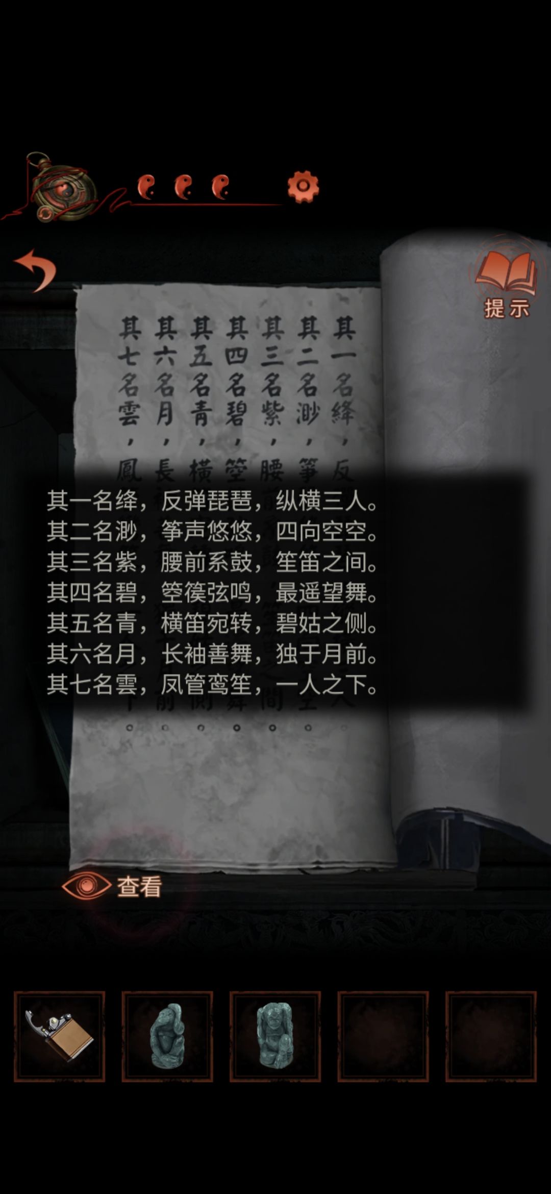 点击右下方柱子,点击中间太极图案,切换男主视角,进入侧门,点击查看墙上资料