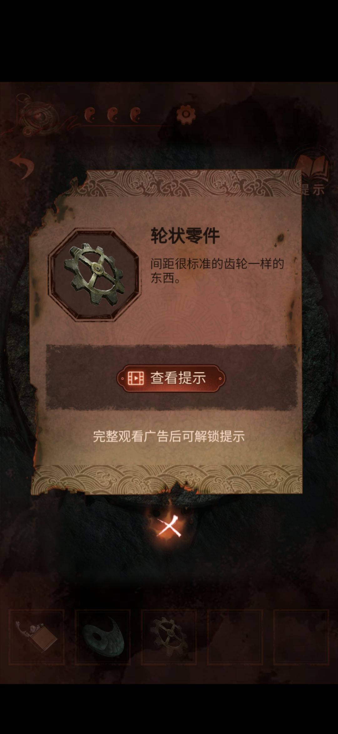 点击大门旁边的圆盘,做游戏,把字挪到正确位置就会亮,没有技巧,全凭运气,打完获得轮状零件