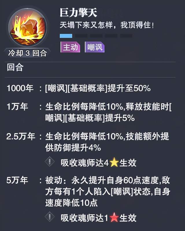 第二位我们看到的是泰坦,虽然泰坦是一位防御系魂师,但在游戏中大家使用泰坦的主要能力则是他的【嘲讽】控制效果,泰坦的3-1普攻拥有100%的基础嘲讽概率,这种概率基本上就是一打一个准,另外泰坦的4-1技能【巨力擎天】还有一个低概率的群体【嘲讽】效果,并且其5万年魂环的被动效果就是永久提升自身60点速度,而靠着这个被动有些玩家甚至会用泰坦在战斗中带速度魂环去抢一速......另外泰坦配合小白也可以起到更强的控制效果,所以这也是他为很多玩家所津津乐道的一个特点。