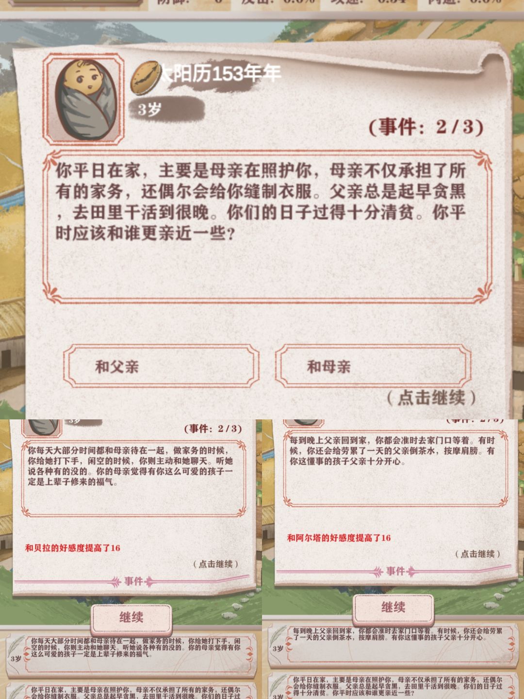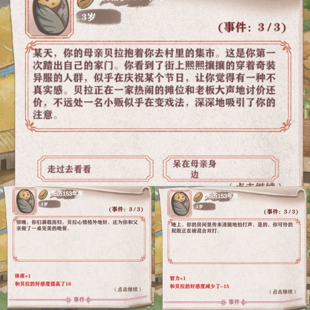 14.给路边变戏法吸引,过去智力+1,妈妈好感度-15;呆在妈妈身边+1体质,妈妈好感度+16。