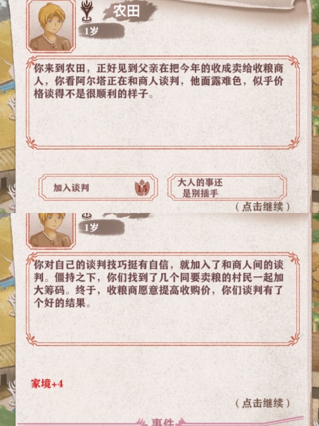 11.父亲和收粮商人谈判,需要15魅力值,+4家境。