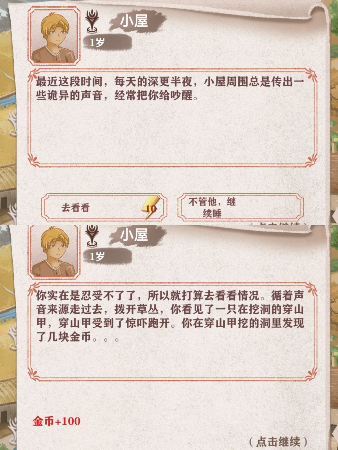 10.晚上睡觉有异响,寻找来源有概率获得100金币,有概率什么都没有。
