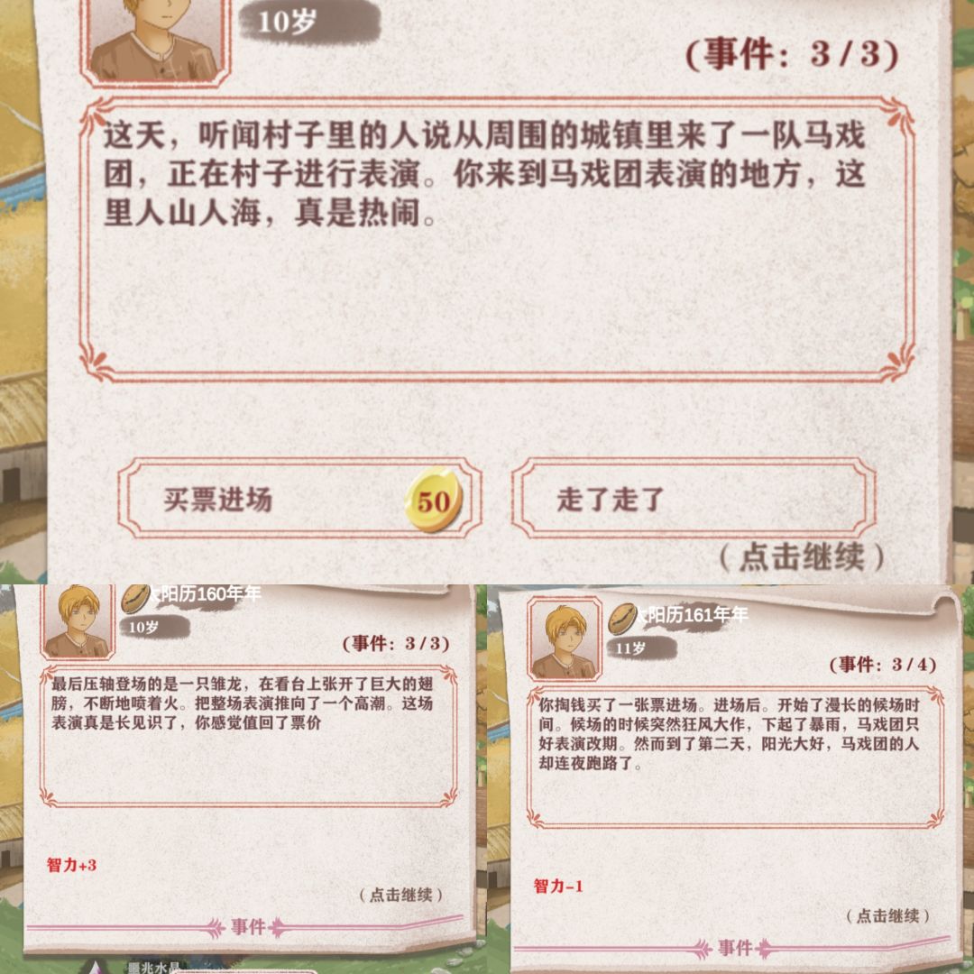 15.花50金币去看马戏团,概率+3智力,概率-1智力。