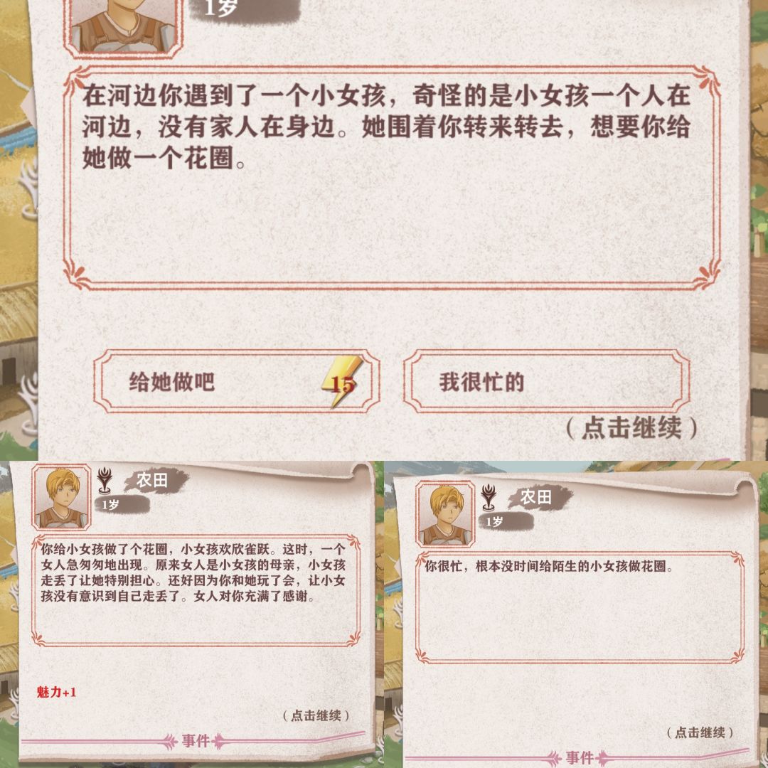 17.在农田看见一个小女孩想要花圈,帮她做魅力+1,不做没有事情发生。