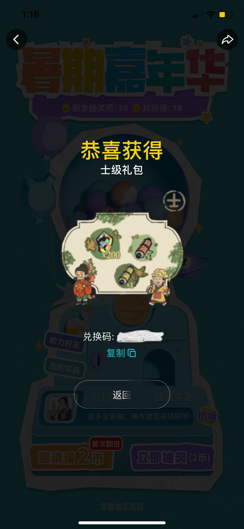 赶在暑期嘉年华结束前抽中一个士级礼包