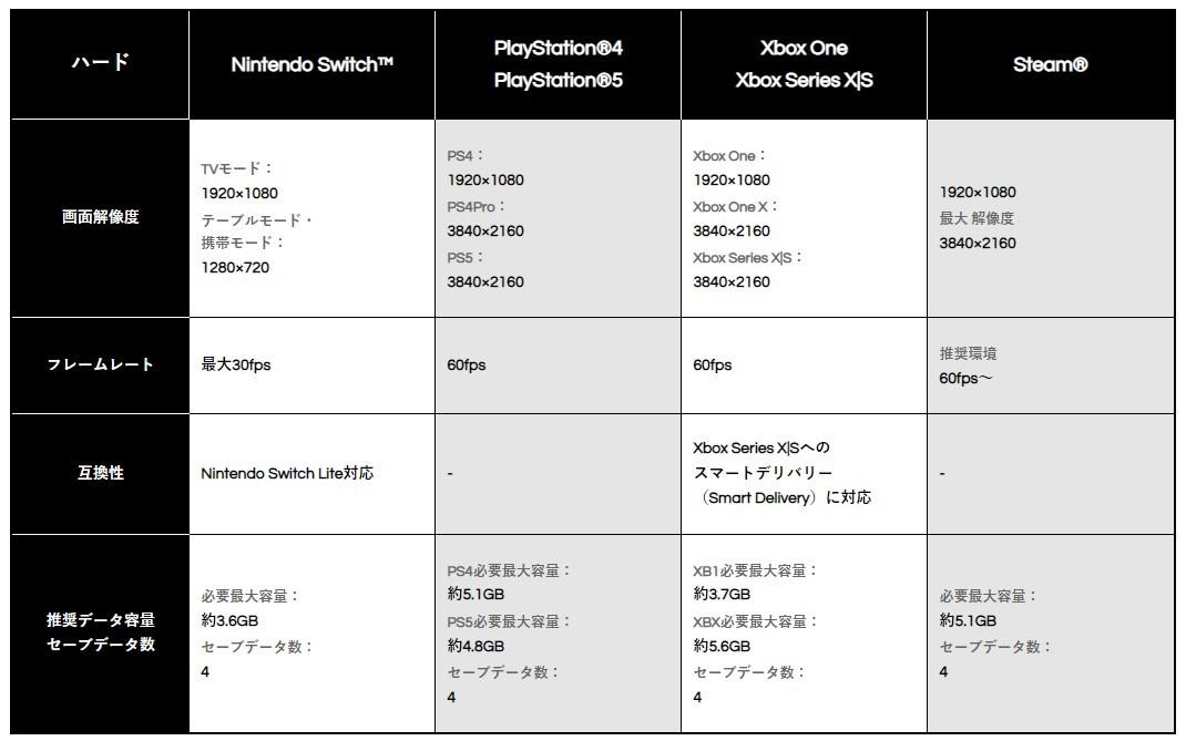 通过上面官方给出的表格不难看出,Steam版本和次世代主机在画面表现方面最佳可达分辨率3840*2160、帧率为60FPS,而任天堂Switch则由于性能相对不足,分辨率最高为底座模式1080P,掌机模式720P,两种模式下的帧率最高仅有30FPS,对于一款动作游戏来说,勉强及格。