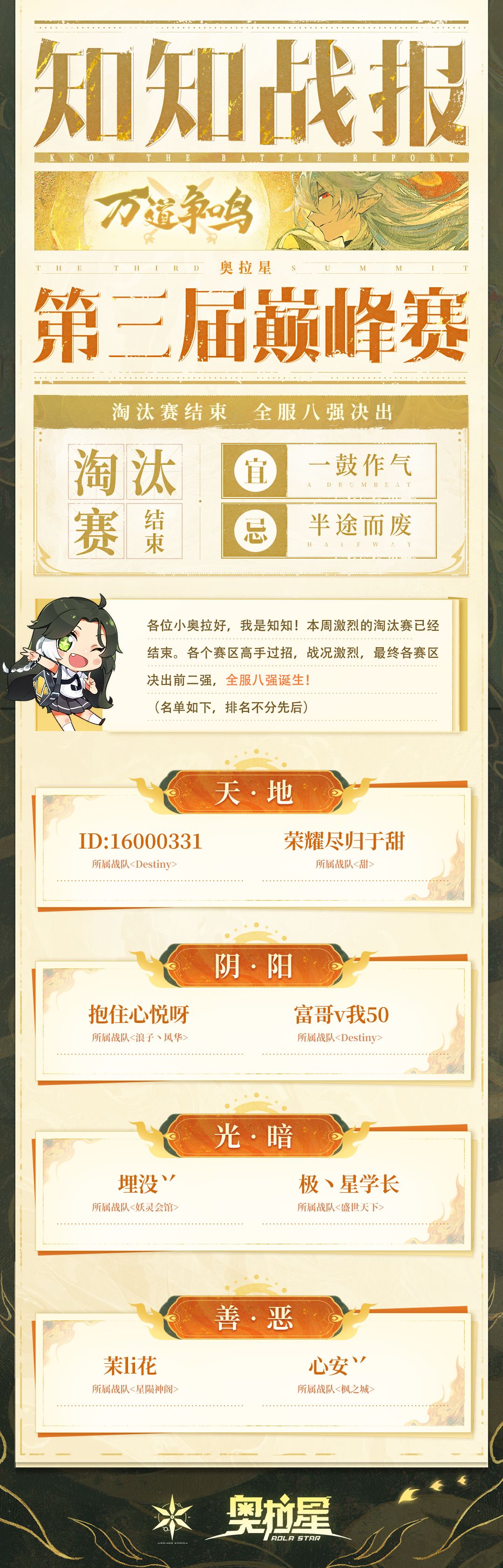 经过本周的三轮淘汰赛角逐,目前四大战区已经决出二强,全服八强选手已经诞生!恭喜这八位小奥拉!