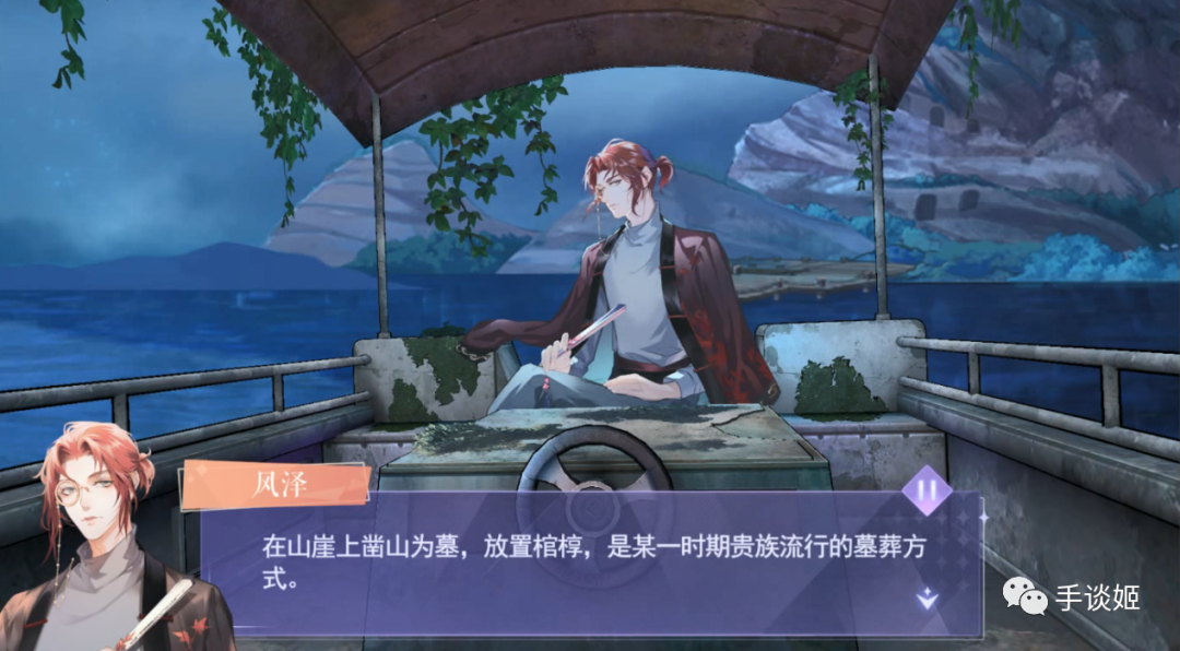 比如在这个场景中,众人在夜晚去小岛查案,在游戏的实际画面中还能感受到小船在左右晃动,共同荡漾在一个涟漪里,诡异中又带点浪漫。