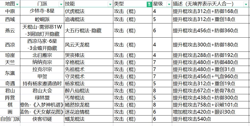 一、被动篇棍和大多数职业一样,优先学武器攻击被动,然后是攻击、防御、筋骨,气血。力量收益比较低,7星以下的力量被动不学,身法在命中不够的时候就补点,命中够了就不学。附上一张武器被动表,其他的请查群文件的江湖小数据