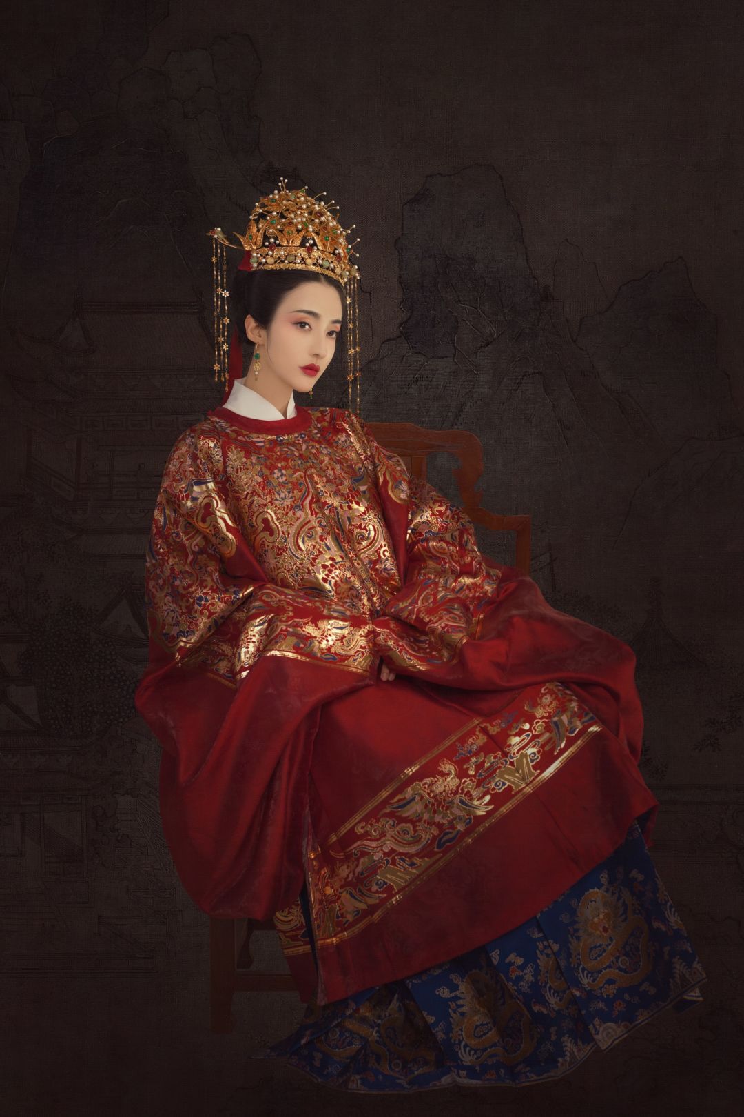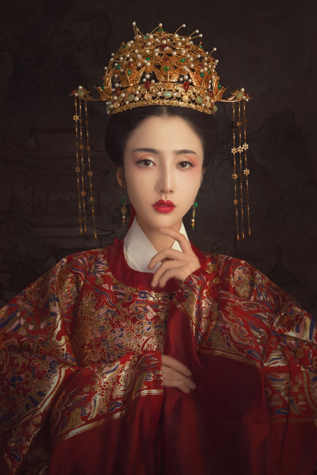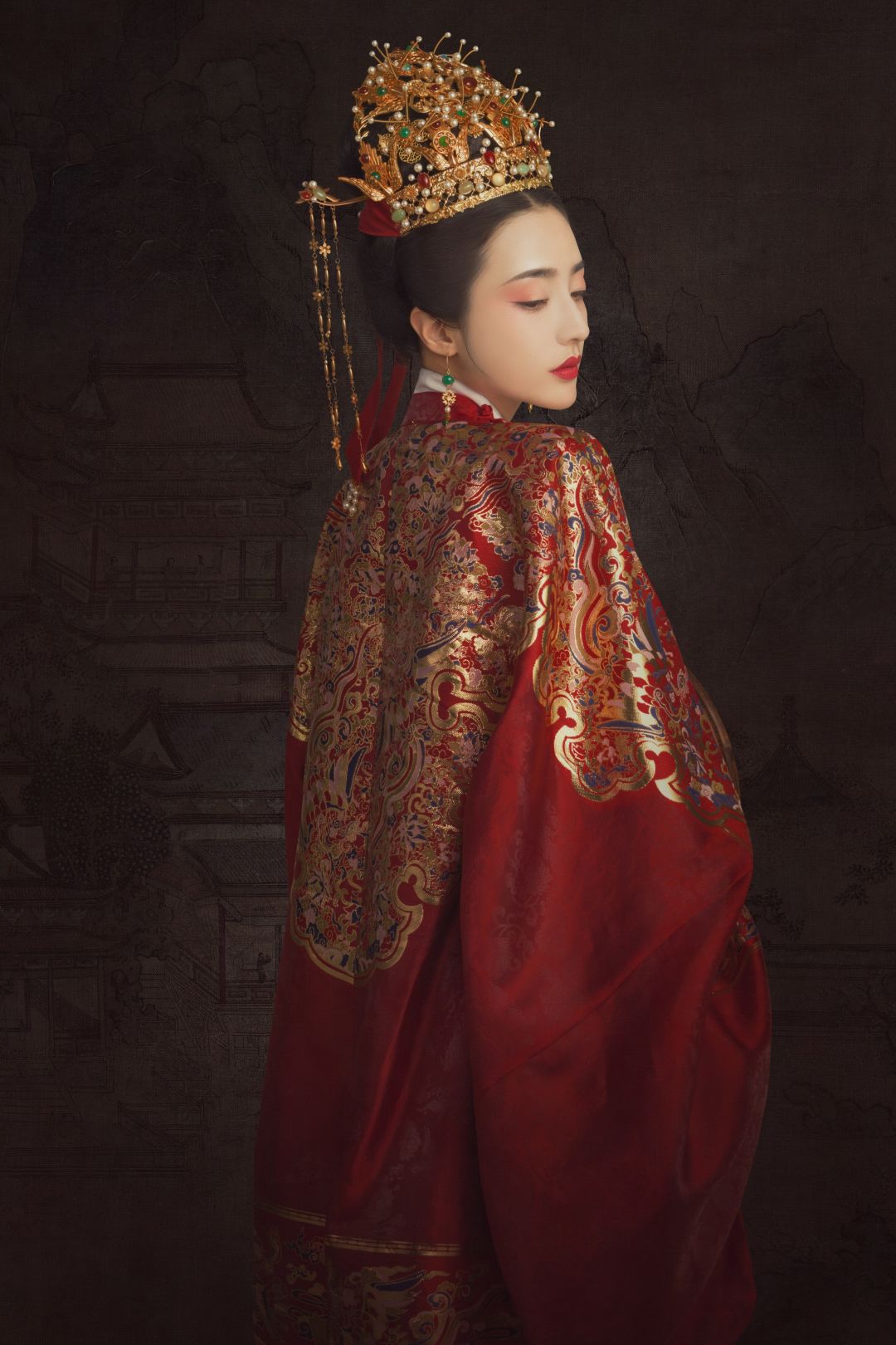 此次《我本千金》与盘子女人坊牵手,共推经典原创主题“更漏子”。主题取名唐代予景抒情词牌名,整体配色以中国红为基,华服上精心装点金丝刺绣,配上金色凤冠,手持非遗团扇,颇有《锦衣之下》中袁今夏凤冠霞帔的几分神韵呢!
