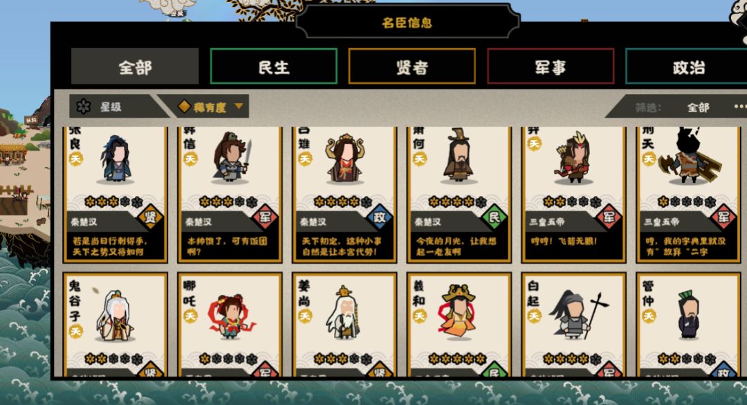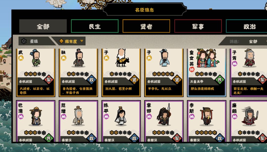 从大约两个月前的萧何卡池开始入坑这个游戏,到现在除了两个氪金名臣,我还差七个就全有了😁,现在四个五星名臣😄