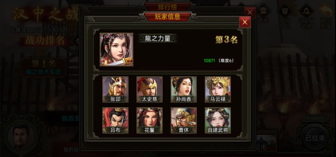 第3名是龍之力量军团。龍之力量军团配备的武将有张郃、太史慈、孙尚香、马云禄、吕布、花鬘、曹休+3个自建。