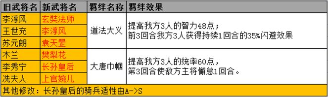 本次只是修改了名称,势力、品质,对武将本身属性和技能效果未做任何修改