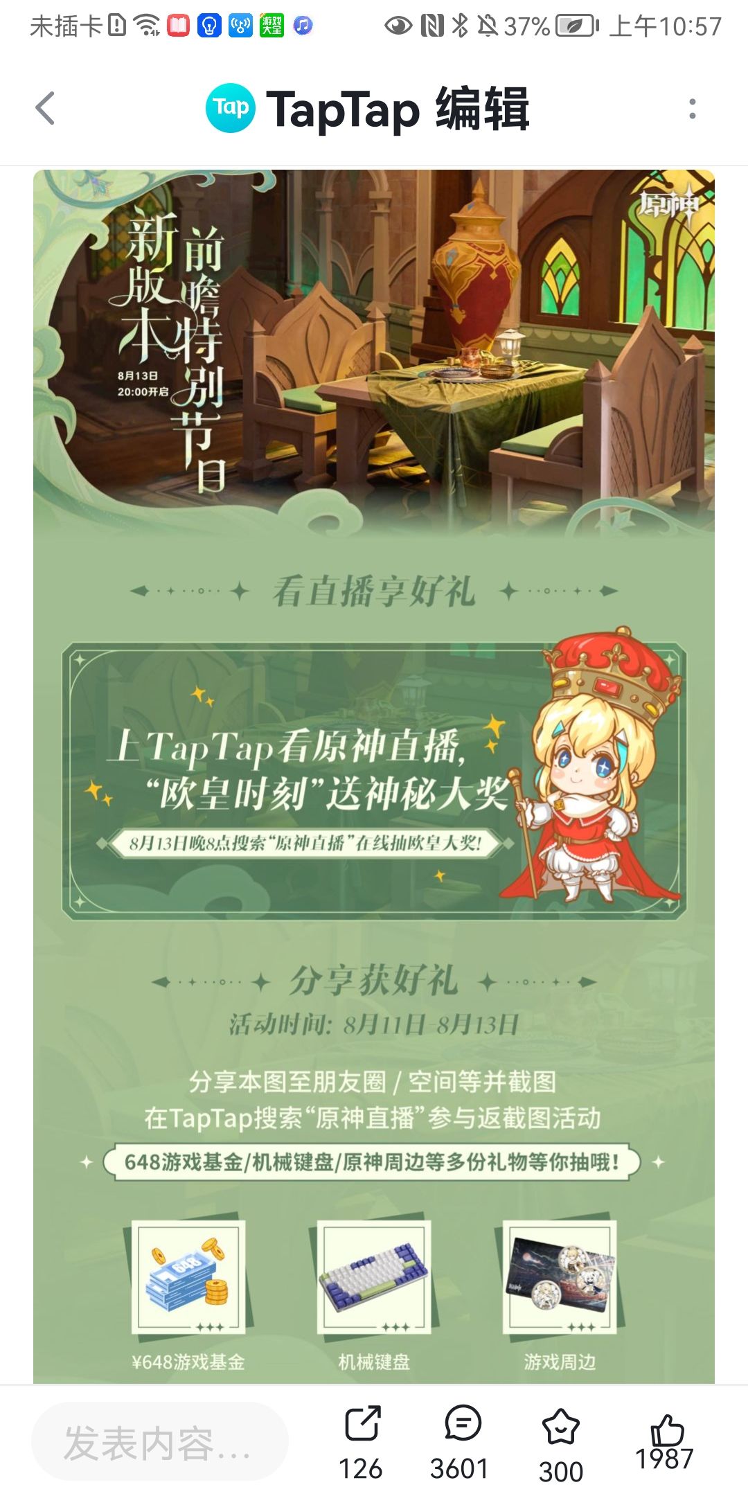每次更新会补偿1600个原石,直播间还会送出14514张648基金劵。