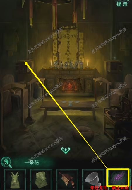 27. 将【梳子】放在右边椅子上的铜盆中,【鼓】挂在右边架子,【铃铛】挂在左边的架子上,如图27进行摆放,点击神案下的神像,获得【桃木剑】。27