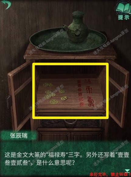17.查看桌子上的书,对照墙上的百寿图,找到书中特殊符号所对应的寿字(书上的线索需要向左倾斜90度,根据书上一堆空格里符号位置,去数符号对应百寿图的位置找到对应寿字),查看左边的柜子,对照特殊符号上的数字,调整锁中的图案,打开柜子获得【羊头雕像】和【猪头雕像】。17 17.1