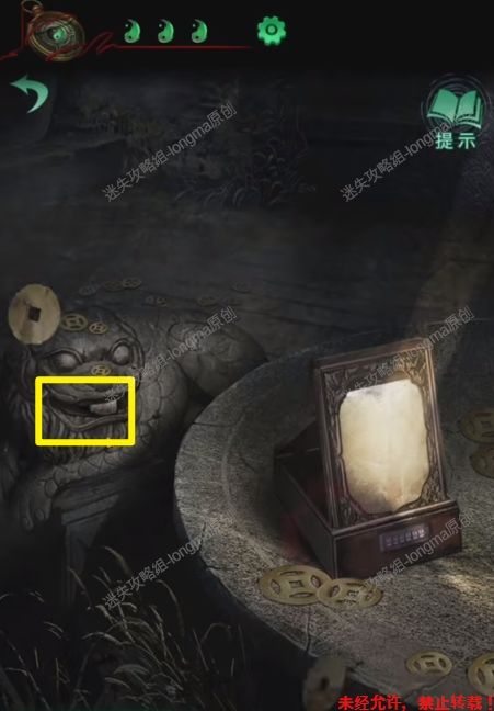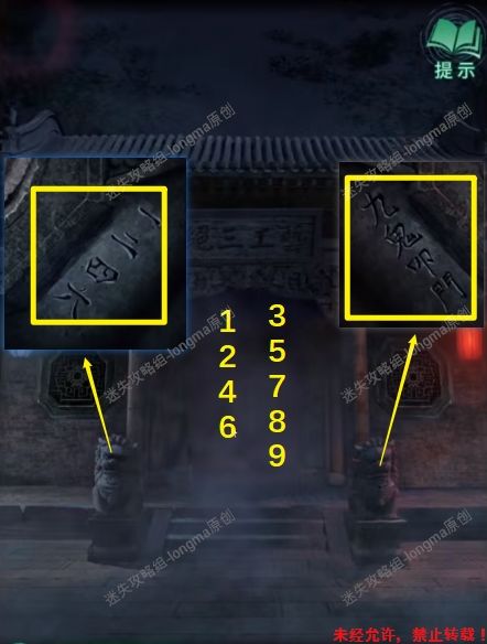 2.查看门口的两个石狮子,左边写着1246,右边写着九鬼扣门,需要扣门9下,左边是1246,右边是35789,按照此顺序敲击门环,进入院子。2