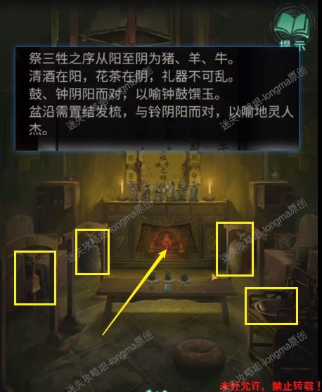 25.查看中间的桌子,如图25根据书上的记载将【一杯酒】【一杯茶】三个生肖雕像分别放在对应的位置(男-阳,女-阴,男左女右,阳-左,阴-右)。25