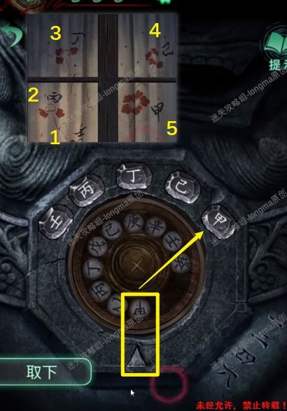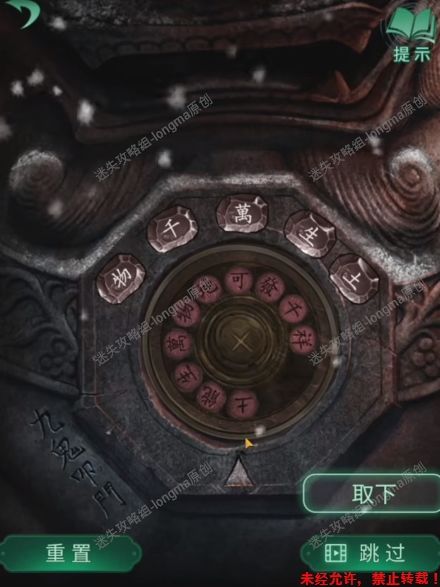 10.回到大门口,将【拨号盘外壳】安装在石狮子上,对照窗户上得到的线索,转动圆盘将对应的字依次到达下面三角位置(窗户上花瓣的数量就是顺序),获得【钥匙】,取下【拨号盘外壳】。10 10.1