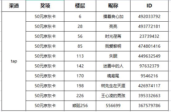 2.本神将抽取回帖总楼层数的第2%、10%、20%、30%、40%、50%、60%、70%、80%,90%楼的玩家,各获得一张50元京东卡!共计十位获奖者。(公式为:总楼层数*10%,20%...90%举个例子:假设有90楼的人回复本帖,就是第90*10%,90*20%,...90*90%楼的玩家中奖,也就是2楼,9楼,18楼,27楼,36楼,45楼,54楼,63楼,72楼,81楼的玩家中奖~按公式计算如有小数点的采用四舍五入方式定位获奖楼层!!!)