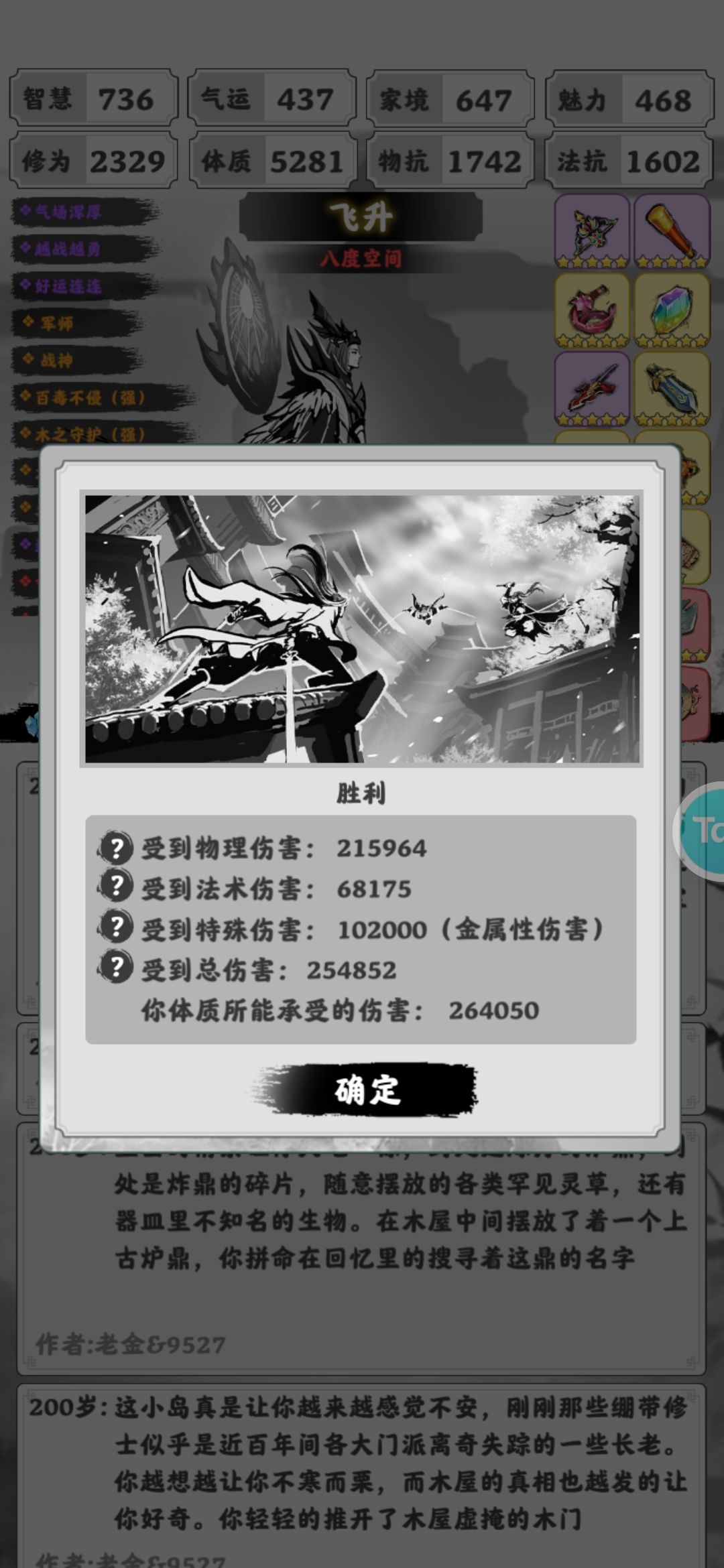 177判定智慧420 186判定气运423(这个不太重要)190判定家境492 194判定智慧425修为1800(所以194之前飞升 最好是爬塔之前或者之后飞升 早点解锁格子等装备)201判定智慧魅力气运640 看智慧就行了 加200物抗