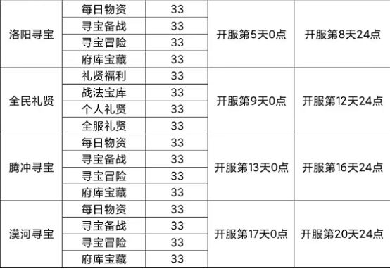 卡牌游戏肯定离不开运营活动,这是养成资源主要来源。大唐的活动总的分为两种,一种是寻宝活动,另外一种是礼贤活动。寻宝活动呢主要是为了换取醒邃石和七窍玲珑石的,而礼贤活动则主要是抽卡和兑换技能。下图就是活动第一次开启的时间,之后每16天一次轮回。