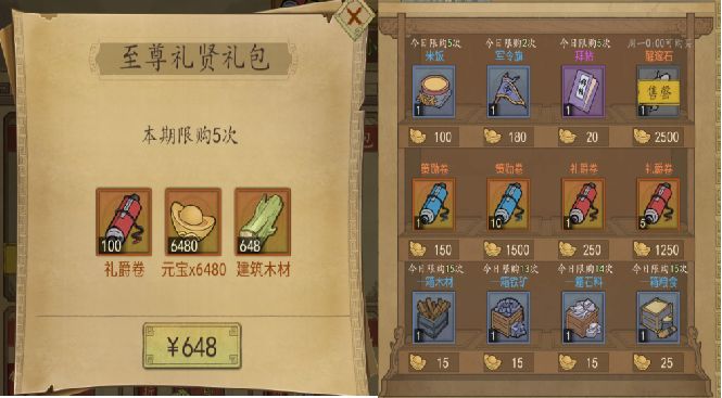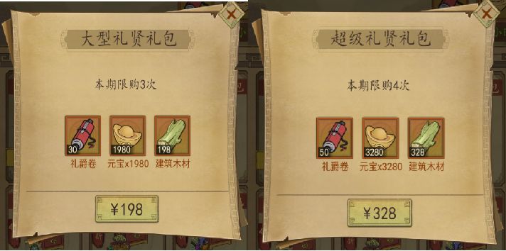 这意味着缺口大概在50个礼爵卷,这时候你可以选择充值元宝或继续朝前推精英副本等渠道获取,但是我推荐不如花点小钱买个礼包解决一下,看下图的两个礼包就是为千元党定制的,所以我的充值攻略上,礼贤活动礼包为备选项目。