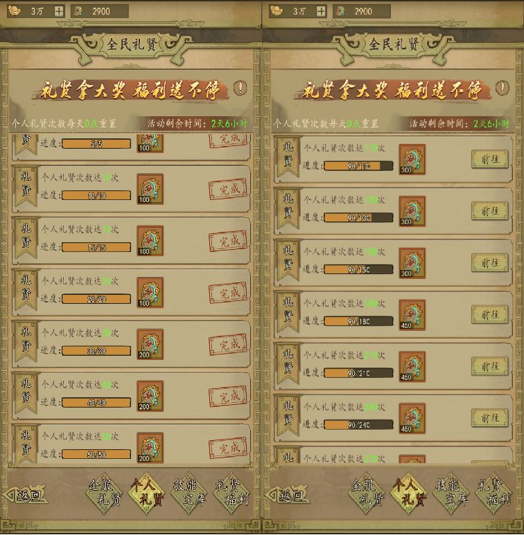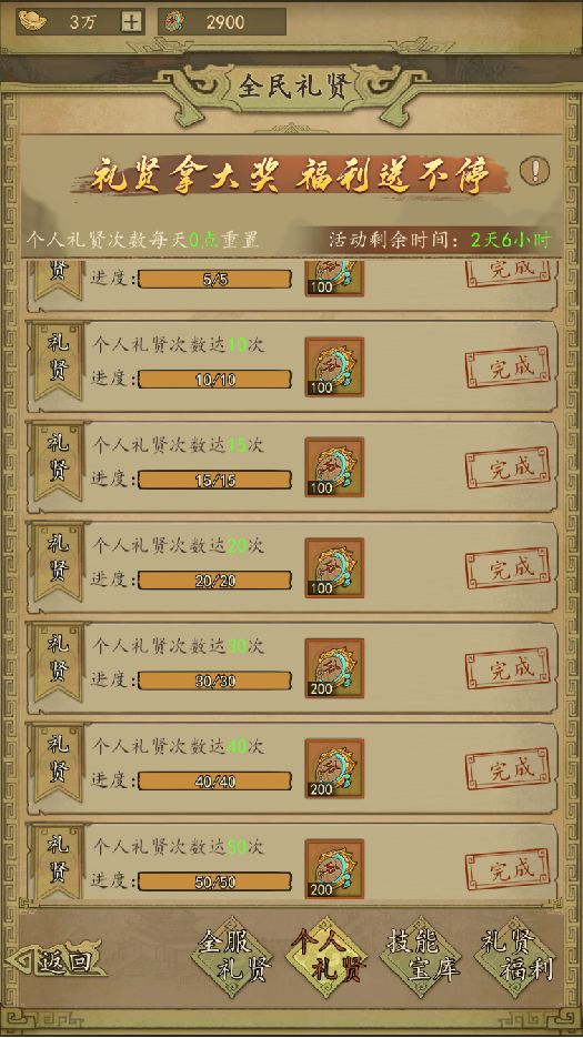 官方的活动肯定每个人都能完成,平民没有12W元宝也可以正常获得礼贤技能,我们只要稍微观察积分列表就可以发现,0到50抽送的积分是性价比最高的,50抽可以获得1000积分,而50-110抽才送900积分,由此我们就可以得知最大性价比抽奖为每天50抽(因为积分列表每天重置),4天活动我们获得4000积分,无法兑换技能,得存到下次活动继续。