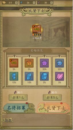 这个活动是这个游戏消耗元宝的大头,也是提升速度最快的活动,它是靠礼爵卷进行抽奖获得对应次数的积分奖励,然后用积分奖励兑换相应的礼贤技能。而礼爵抽奖可以获得大量我们需要的武将卡片,还会有随机将魂,宝石等材料。这个抽奖非常看运气,运气好的5连直接3个武将,运气差的30抽才一个。