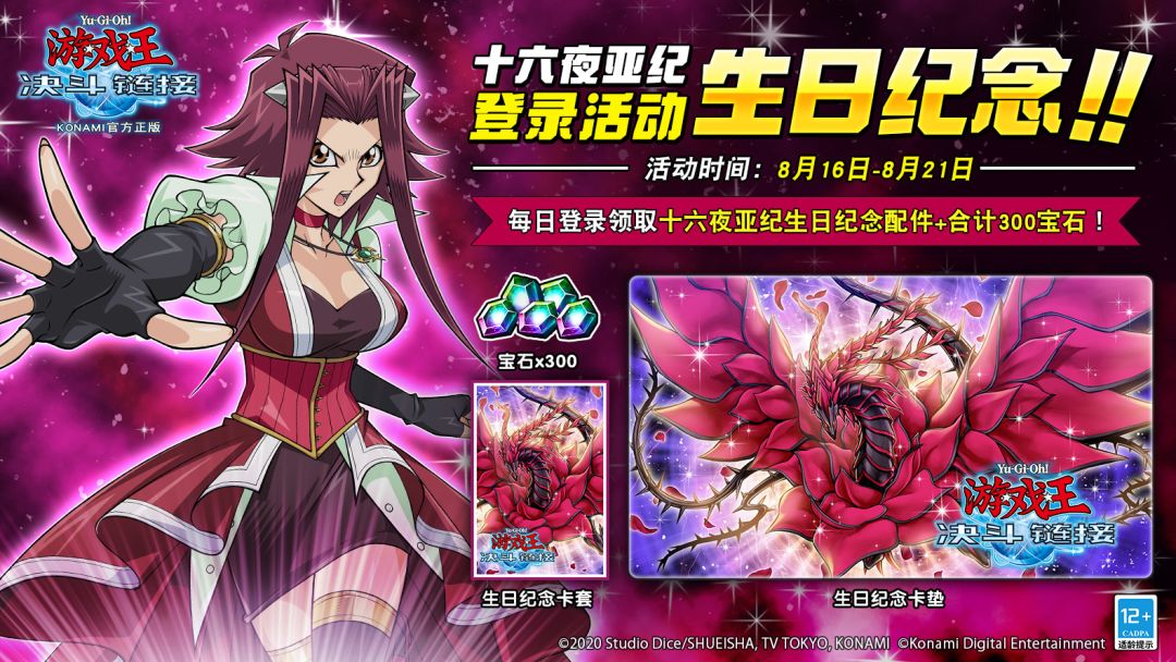 8月16日至8月21日期间,每日登录游戏即可获得合计【宝石*300】,累计登录2天以上还可获得【十六夜亚纪生日纪念卡套&卡垫】!