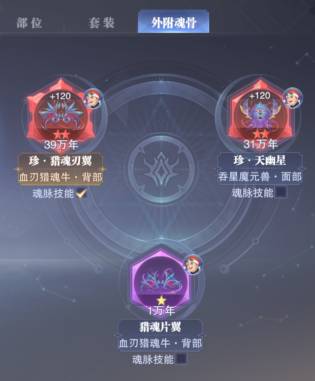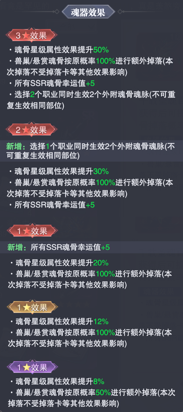 魂骨星级属性提升兽巢/悬赏的魂骨掉落会有一定幅度的额外掉落SSR级别魂骨的幸运值提升1-2个职业可同时生效2个外附魂骨魂脉属性
