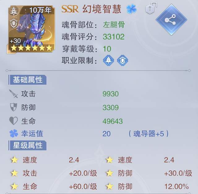 这里特别要提到的是魂骨的星级属性并不包括其基础属性,只是那六颗星能为我们提供的增幅,例如上图中的6星SSR左腿骨,没有魂导器时的速度提升为2点,而有了魂导器后则为2.4点,符合20%的提升量,另外专属魂骨的幻化属性这个也能生效,这点大家还需要注意。
