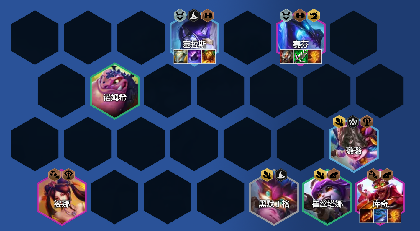 幽影蛙法 这周在数据非常亮眼!阵容吃分场次104场,吃鸡场次26场,吃分与吃鸡排名第1名 。在高出场率下阵容的吃鸡前四占比也高达到25%。幽影蛙法 阵容是这周更新后新崛起的阵容,由于3驯龙的增强,这套阵容出场即巅峰。这套阵容现在在顶级玩家中是出场率最高的阵容,但不算稳定最高时候一局4名玩家选择这套阵容,但也经常出现一局没有一家选择的情况。由于这套阵容成型比较容易,强度略有超模,只要又赛芬与4星诺姆希就有吃分的可能。这套阵容可以说是这版本吃分最稳的阵容,没有之一 。但这套阵容由于比较卷,比较建议大家在开局有驯龙在选择,否则后期容易蛙养不起来。幽影蛙炮