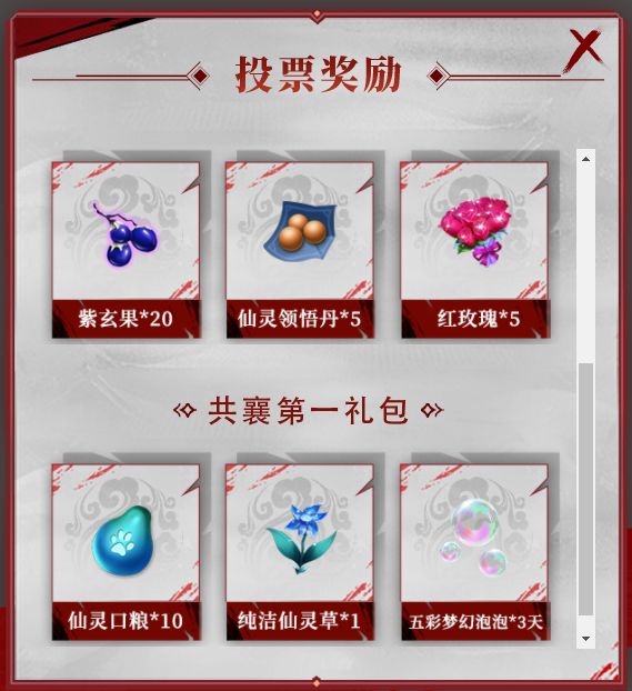 登录参与投票即可免费领取【投票礼包】,如果你支持过的帮会获得了人气第一,还有【共襄第一礼包】可拿哦!