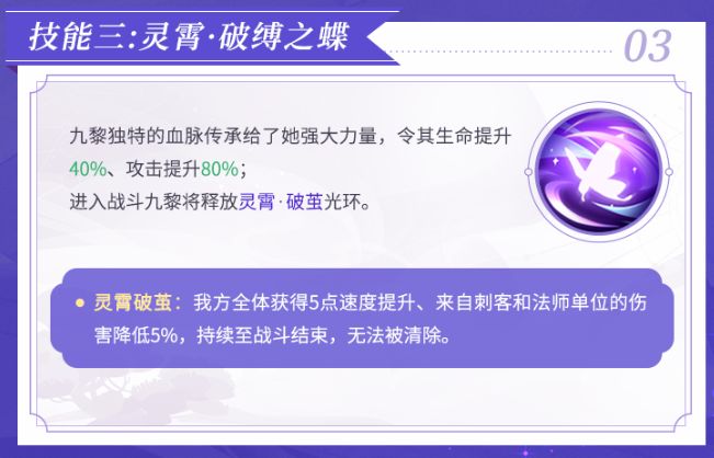 评价:自动瞄准人数最多也就是至少能打到两个目标,3次击中即可触发【销魂蛊】,符石幻兽各种攻击蛮容易达成的。最亮眼的是伤害基于九黎生命值,(又是一个死堆生命就完了的工具人,工具人堆生命是最好培养的,既保证了生存能力,又不花费太多资源),而且必定眩晕,带稳定硬控的能有很高的上场机会。