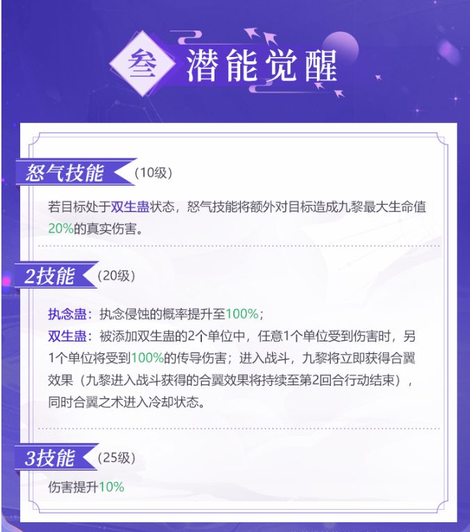 2技能的复活减血必定触发、【双生蛊】目标传导伤害变为100%、进入战斗即刻【合翼】两回合。