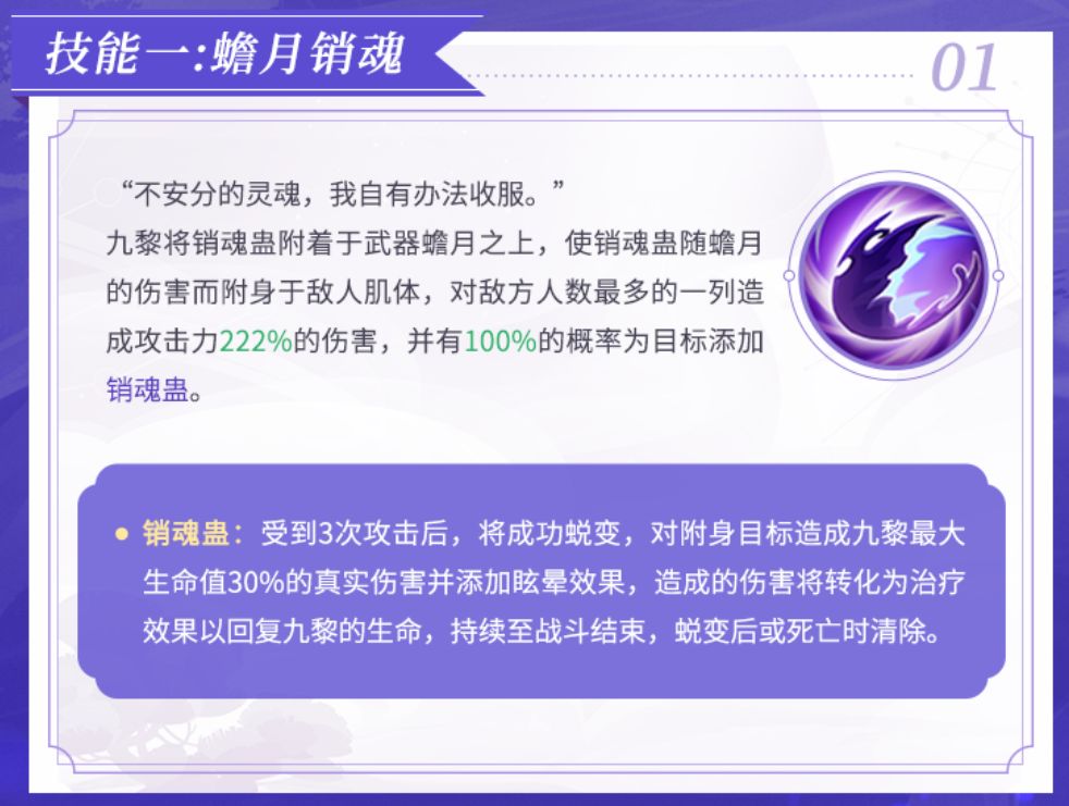 【销魂蛊】:目标被打中3次后造成基于九黎最大生命值30%的吸血伤害并眩晕