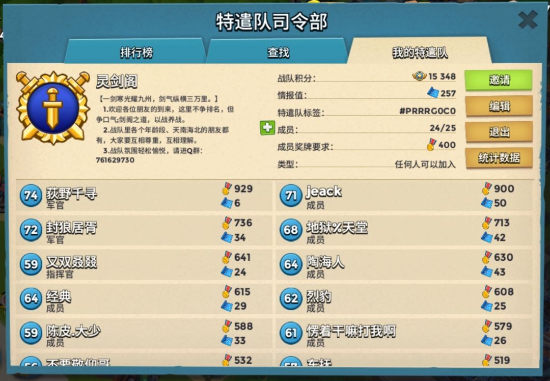 战队【灵剑阁】,在此诚邀各位朋友的加入,指挥官上班族,天天在线,战队Q群:761629730。