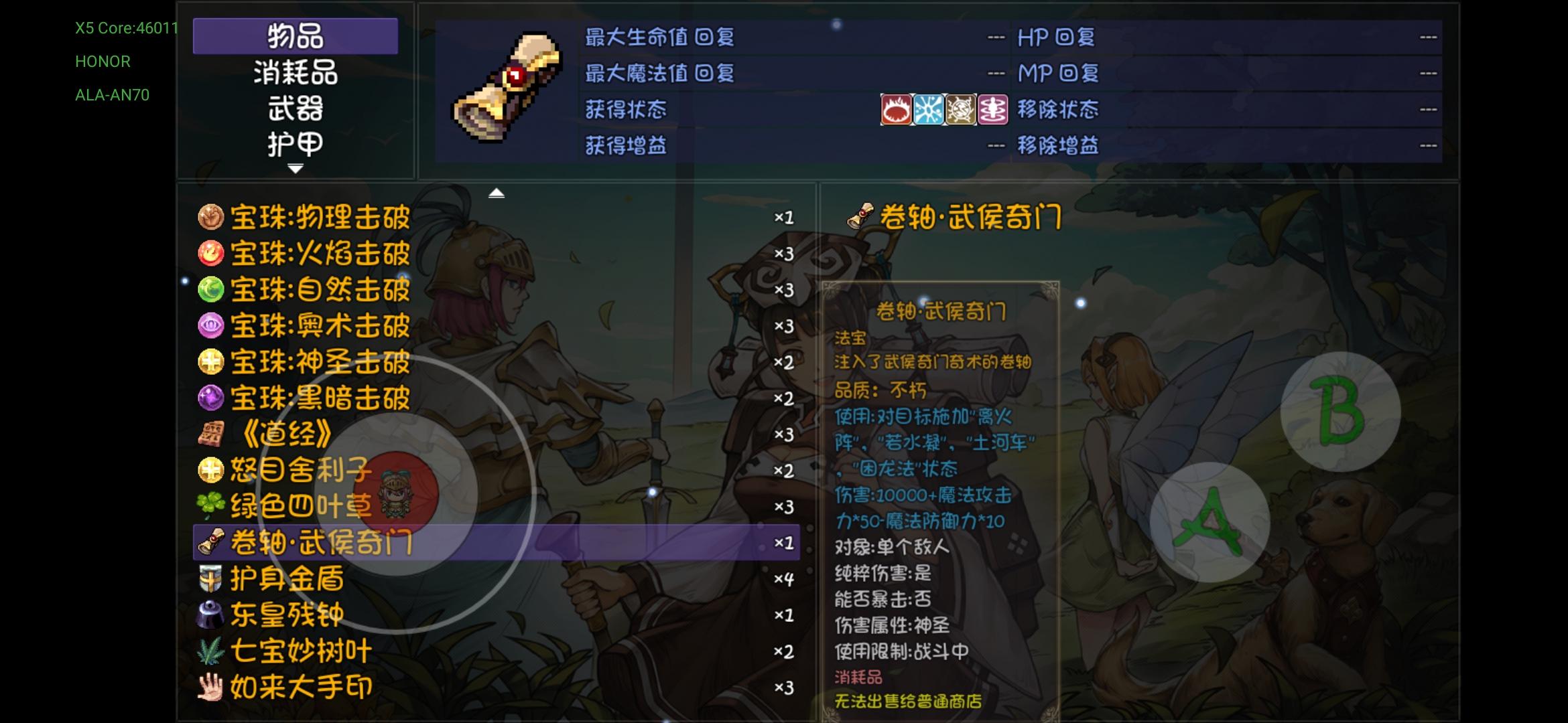 卷轴:武侯奇门:减少目标闪避20%,减少目标命中与暴击25%,减少目标200点双防与100点敏捷,每回合减少目标3%最大生命值(诸葛孔明四种被动,风后奇门同效果)