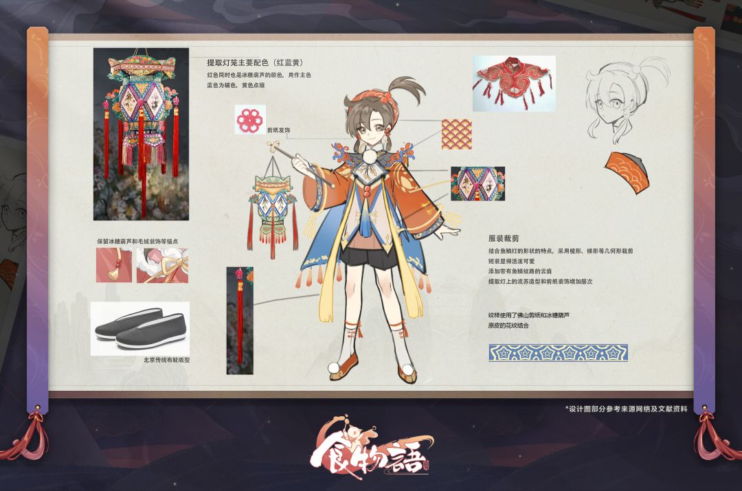 本次管理司为少主们带来《食物语》×鱼鳞彩灯非遗文化联动中冰糖葫芦时装设计灵感来源与思路。 联动限定时装以国家级非遗项目“佛山彩灯”的国家级代表性传承人杨玉榕大师制作的鱼鳞彩灯为原型,提取灯笼的配色为主配色,结合鱼鳞灯形状及特有的鱼鳞纹样作为服装剪裁结合冰糖葫芦原皮进行设计。