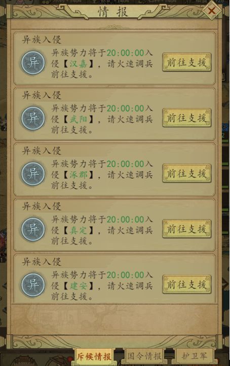 2、游戏冬季19点,情报页面收到异族入侵的预告信息。