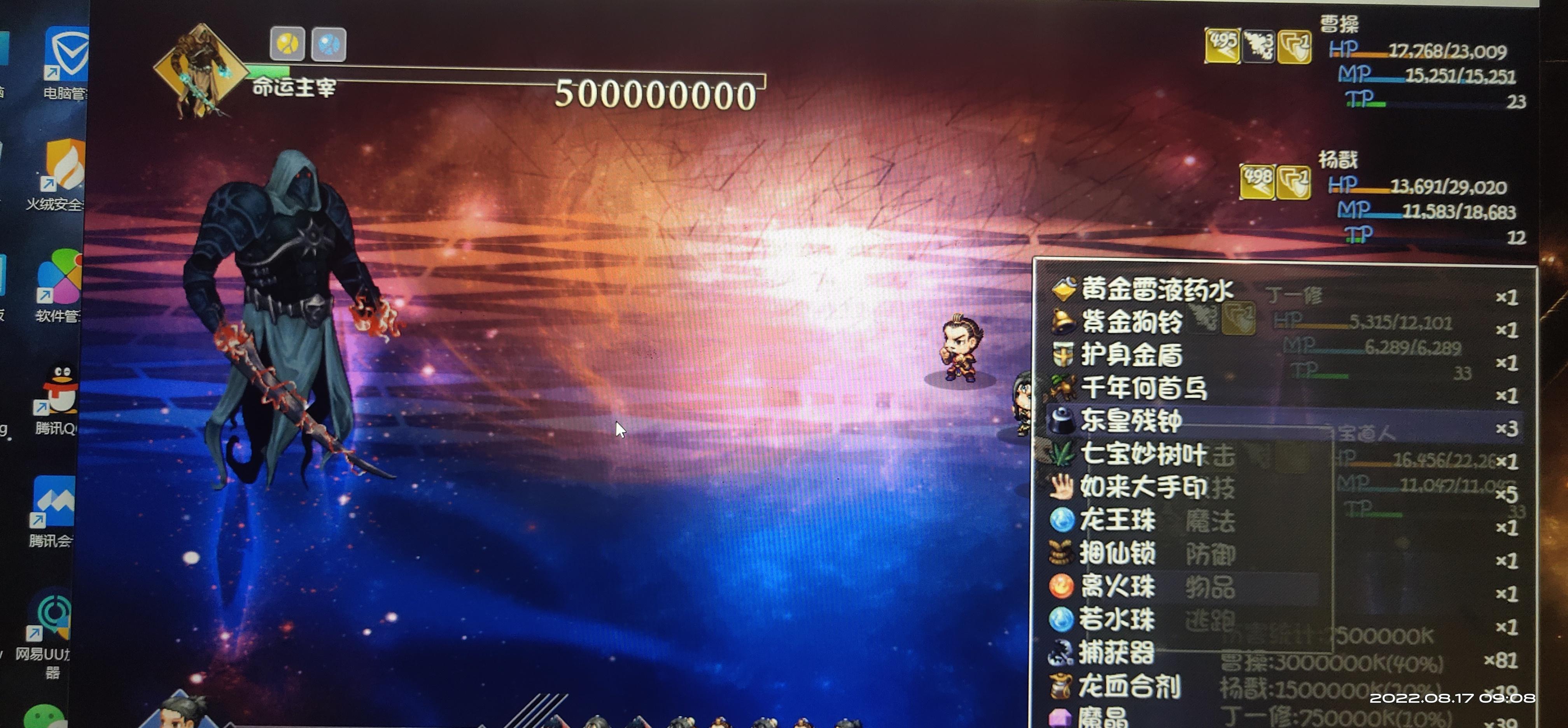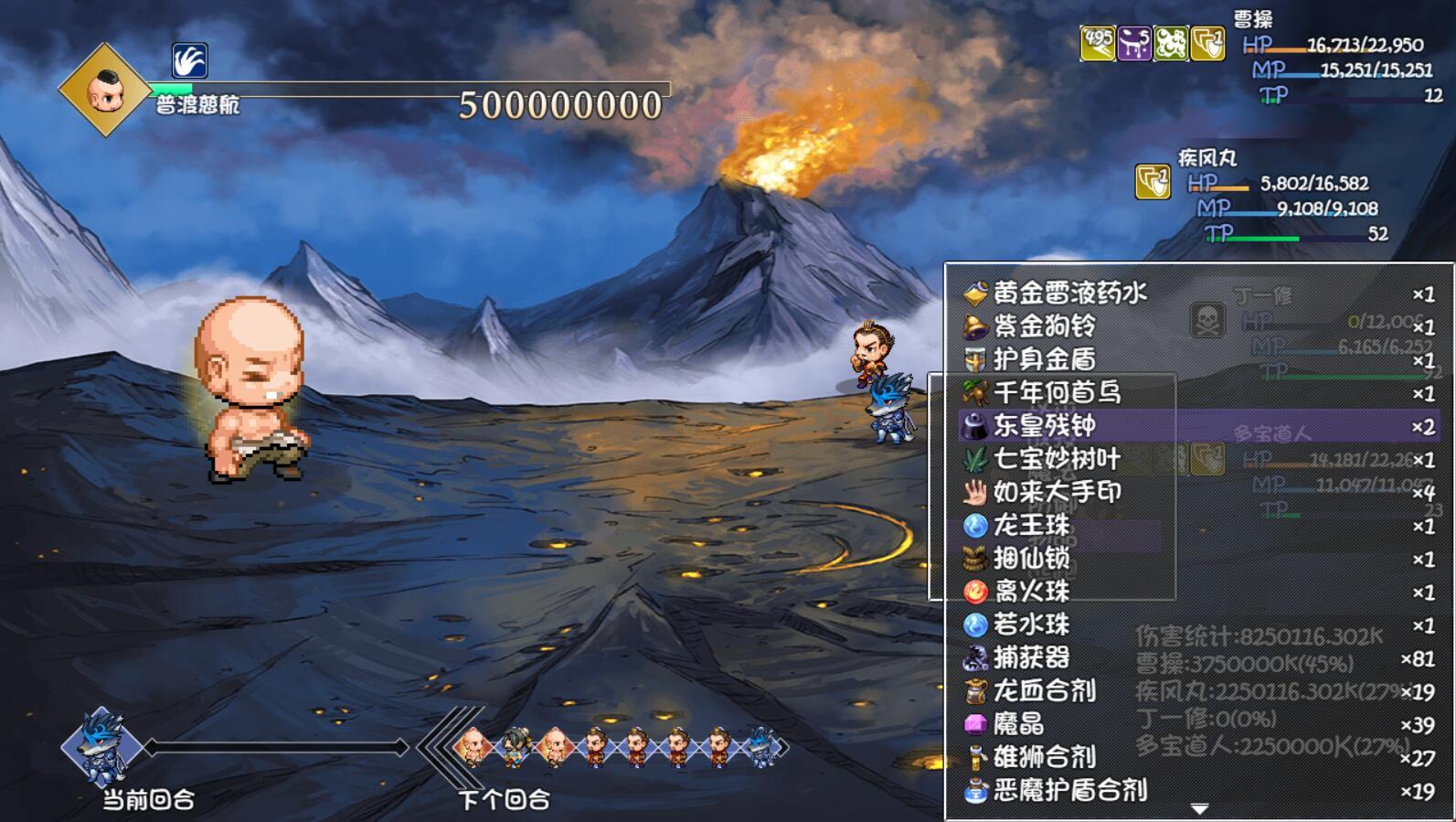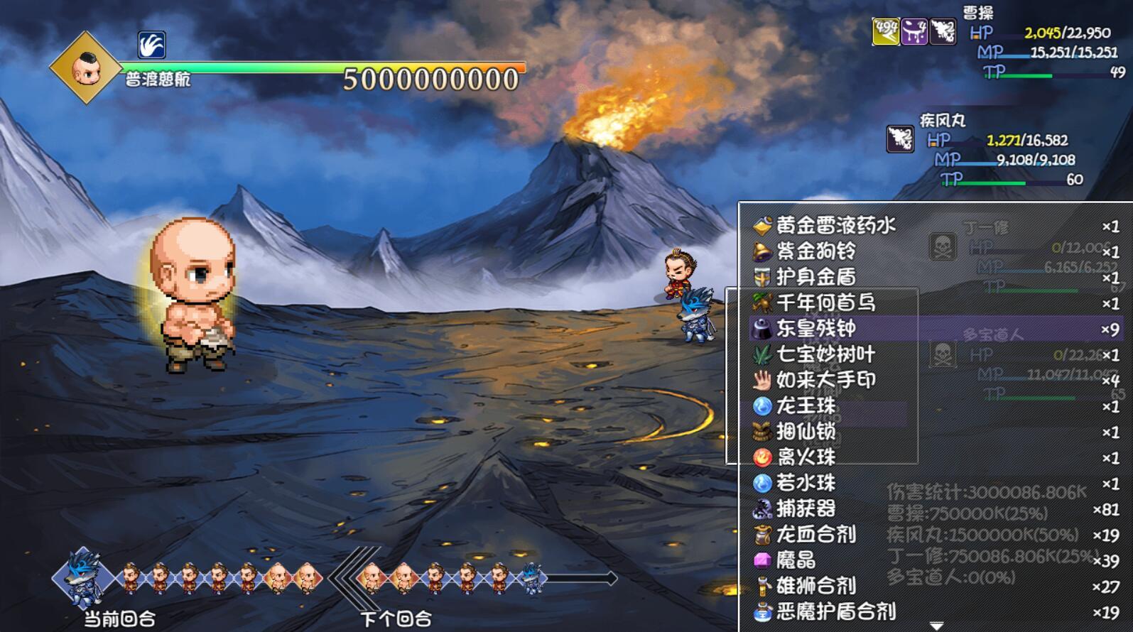 终极逃课之宝藏队大战普渡慈航,过程很简单,东皇钟打至半血,然后如来手印一发防被秒,然后东皇钟将其秒杀,附图