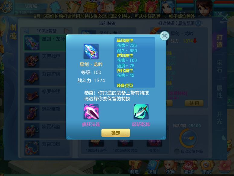 8月17日维护后-9月15日维护前开放夏季打造福利活动,打造时若附加特技将必定出现2个特技,可从2个特技中任选其一,帽子部位不触发。
