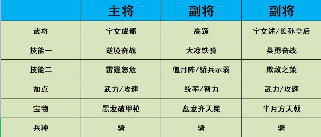 上面的是配将的一些核心思路,你如果能看明白并转化为自己的游戏心得,那么你就可以搭配自己的黑科技队伍。下面说一些常规搭配主流队伍的技能和宝物配置: