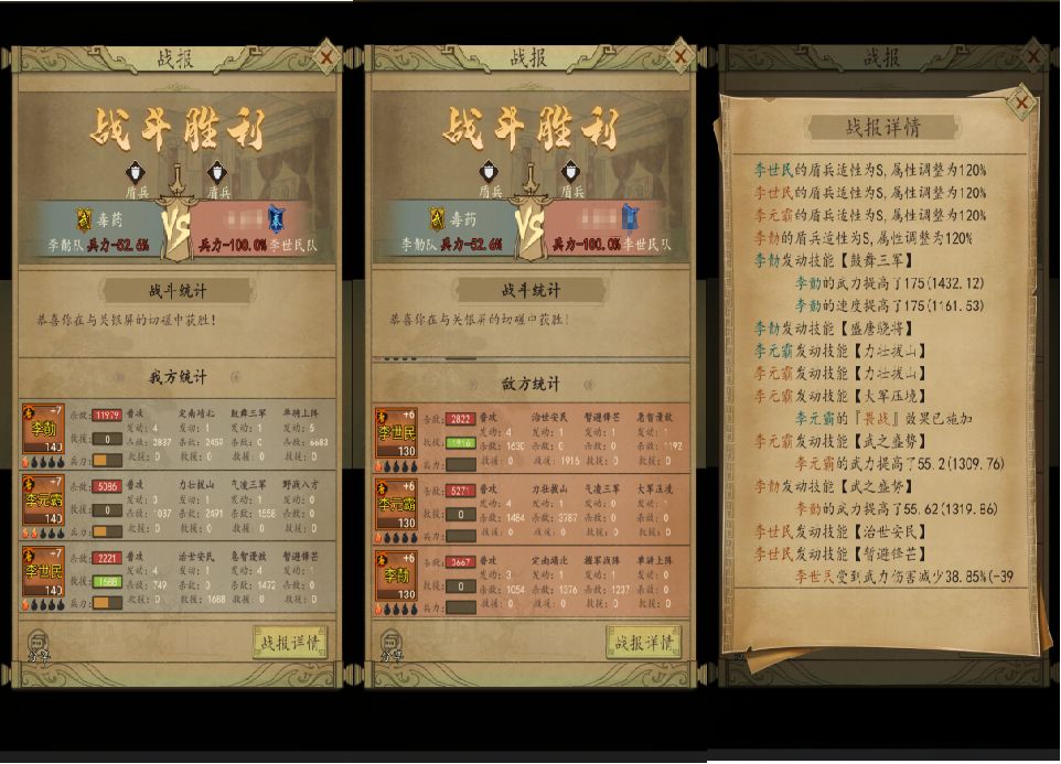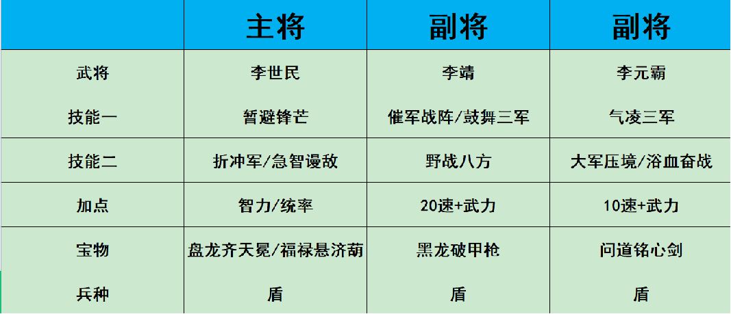 折冲军因为至少3周才能出来,这时候的李世民可以带急智谩敌,加点为统率做副将,李靖做主将进行主力输出。大军压境获取难度也高,平民一般一个月才能获得,所以前期可使用浴血奋战替代。兵种在没有上折冲军之前,可以随便切换盾枪,上了折冲之后就固定盾兵。另外在李世民没有6星或者没有折冲之前,其实是可以使用高颖或长孙皇后对李世民进行替代的,PVP能力可能更强。