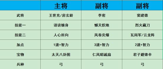 如果能带上诽谤缠身,那么王世充或者房玄龄就可以主将,没有则让李密来做主将,优先培养李密。队伍输出较高,加上房玄龄舍弃羁绊的话控制更加强力,打城或者副本爬塔都非常好用。打架因为兵种克制,也没有特别合适的兵种技能,因此是吃亏的。NPC身上有专属兵种技能,但是我们获得不到,挺恶心。