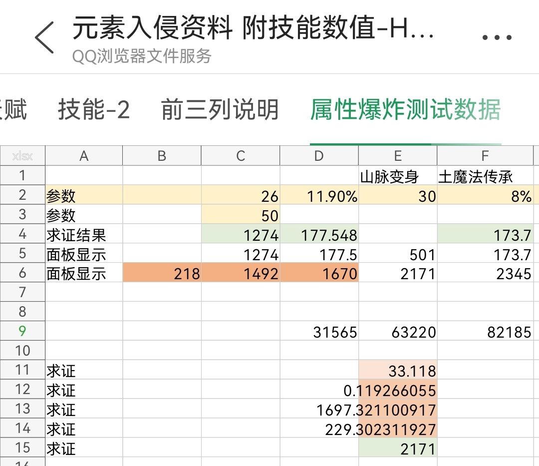 行hang,表示是什么数据,比如黄色的都是设定值,山脉变身会增加30防御,传承会增加8%防御。第五行和第六行都是当时战斗时,面板上显示的数值(实际值)。第四行就是求证,求证为什么第五行的数值是这么多,从哪儿来的,意思是我猜测的算法,如果最后算出来能得到第五行的数据,那就表示计算方法是对的,就会用绿色表示。