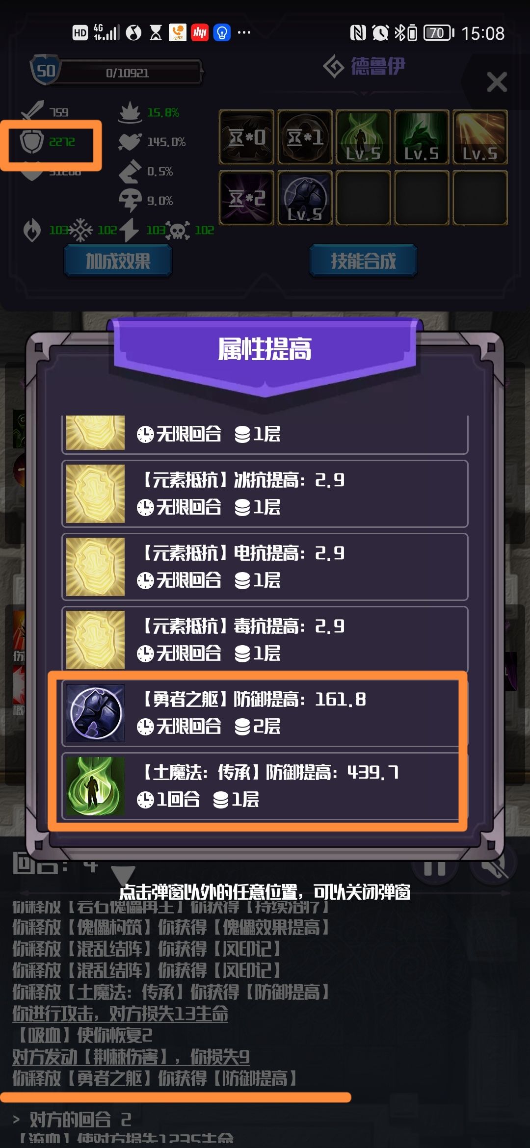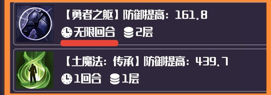 土魔法此时(第五回合)增加了439.7防御。勇者之躯有两层,一共增加了161.8防御。