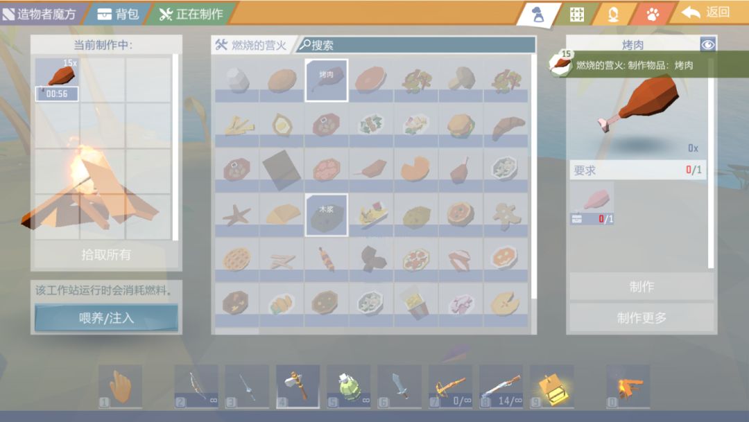 建议萌新以肉食为主,可以制作一些简单的【石器】捕获兔子或其他动物,搭上营火进行烤肉。食用肉类可以获得更久的饱腹感,充饥备用效果远比蔬菜更好。