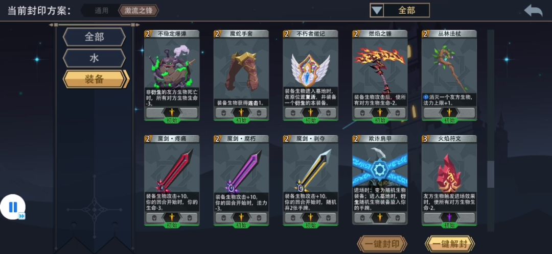 装备卡:能量法球(初始,建议升级,通用),哥布林战旗(初始,建议升级,衍生流派速攻必拿),魔法水晶球(初始,无需升级,玩透骨流秘法比蒙拿的多可拿),突击长戟(初始,可升级,被阻拦加攻和透骨很搭),圣光战锤(初始,建议升级,一费变异蜂群),风灵十字弓(初始,建议升级,衍生流派都可拿)